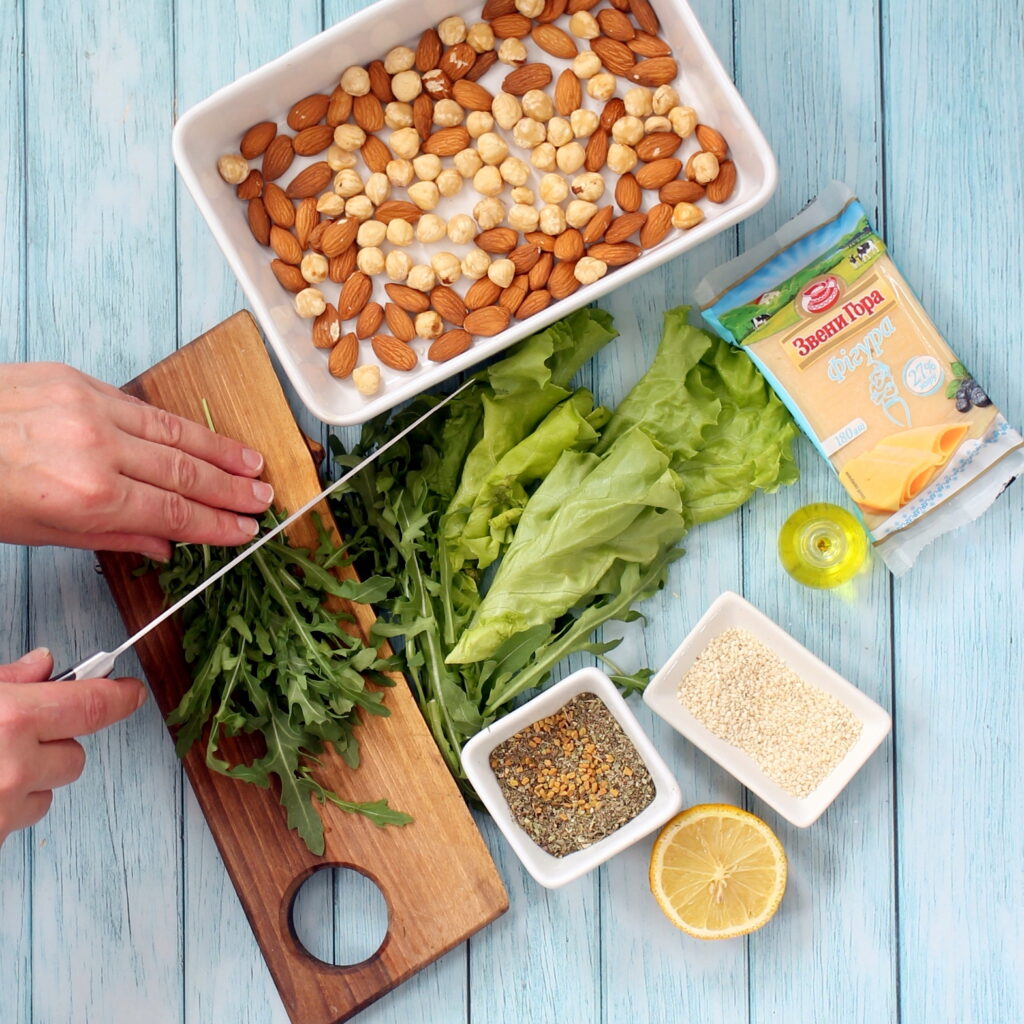 Спочатку можна приготувати дукку: обсмажте горіхи в духовці при 220 градусах протягом 10 хвилин, періодично помішуючи. Потім перекладіть горіхи в цупкий рушник і перетріть, щоб відокремилося лушпиння. Окремо обсмажте в духовці коріандр, зіру та кунжут протягом 5 хвилин. Коли обидві суміші трохи охолонуть, перекладіть їх у блендер, додайте сіль і подрібніть. Суміш пересипте в банку, і на наступний день можна використовувати.