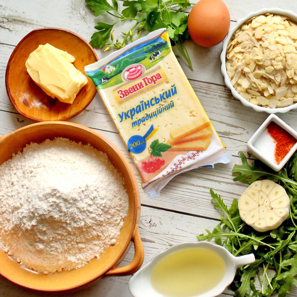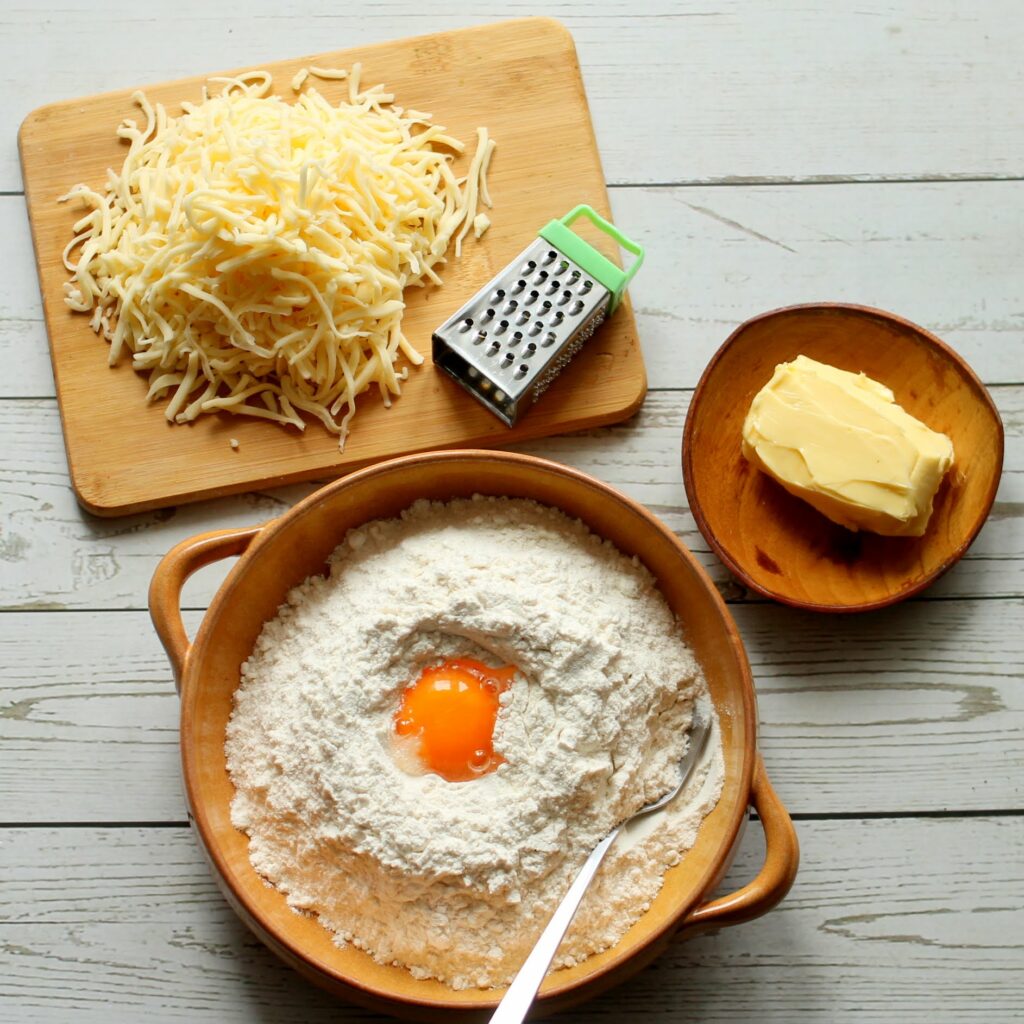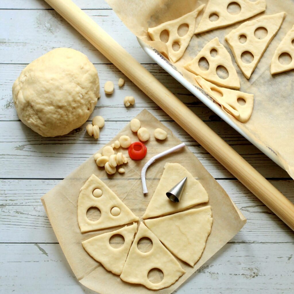 Масло дістаньте з холодильника заздалегідь, воно повинно стати м’яким. Натріть сир на середній тертці (НЕ на великій). Додайте до сиру м’яке масло, яєчний жовток та трохи солі. Перемішайте до однорідної маси. Просійте в сирну суміш борошно, але не все — близько 90 г. Спочатку вмішайте борошно лопаткою, а потім руками. Замішуйте тісто, при необхідності підсипаючи ще борошно, до однорідного й не липкого стану. Воно має залишатися м’яким. Загорніть готове тісто в плівку та покладіть у холодильник мінімум на 30 хвилин. За цей час масло затвердіє, і з тістом буде легше працювати. Потім дістаньте тісто з холодильника, розділіть його на 2 частини. Покладіть один шматок між двома аркушами пергаментного паперу та розкачайте його качалкою в пласт завтовшки 2-3 мм. Обріжте пласт по краю тарілки, а потім розріжте на 8 сегментів. Зручно це робити ножем для піци. Імітацію вічок можна зробити коктейльними трубочками різного діаметра. Повторіть ці дії з другою частиною тіста та обрізками. Акуратно перенесіть "шматочки сиру" на деко, застелене пергаментом і трохи змащене олією. За бажанням можна посипати печиво спеціями. Випікайте в духовці, розігрітій до 180°C, в режимі "верх-низ", близько 15 хвилин. Точний час залежатиме від особливостей вашої духовки. Печиво має зарум'янитися.