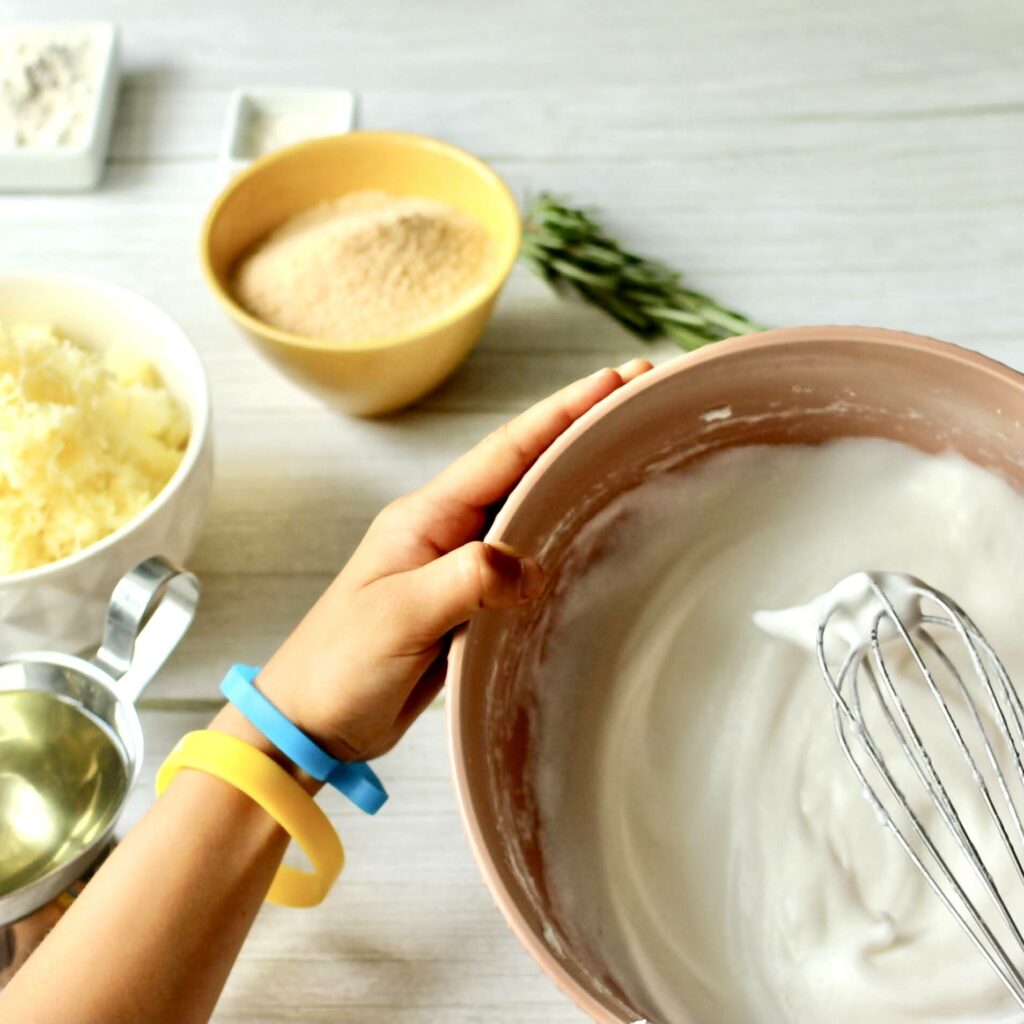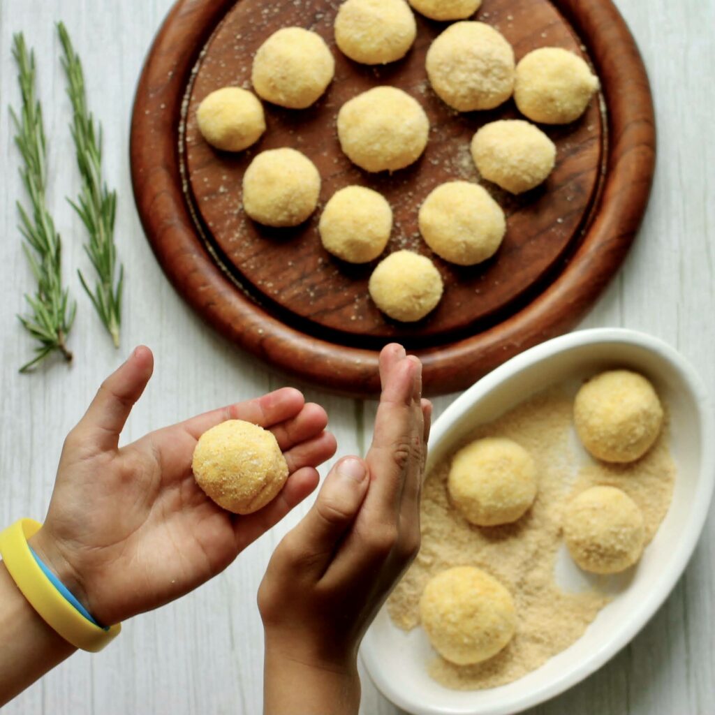 Збийте білки до щільної піни. Додайте просіяне борошно з розпушувачем і ретельно перемішайте. Натріть сир на дрібній тертці та додайте до білків з борошном. Усе добре перемішайте — має вийти цупке тісто, з якого легко катати кульки. Сформуйте кульки, помістіть їх у форму з бортиками, додайте панірувальні сухарі та струсіть форму, щоб кульки рівномірно вкрилися сухарями. Смажте у добре розігрітій олії, потім викладіть на паперову серветку, щоб увібрався зайвий жир.